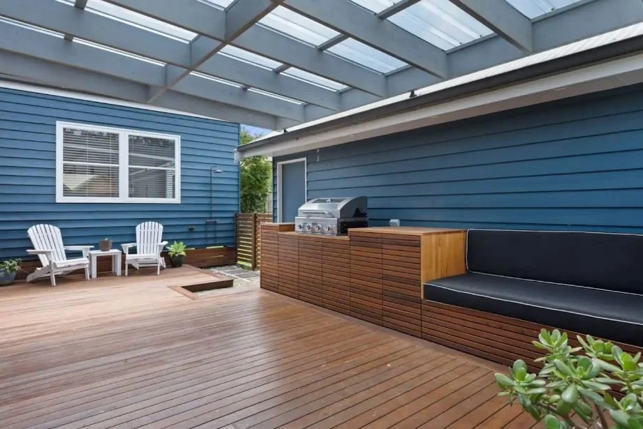 With a beautiful hardwood deck, the entertaining area is dappled in natural sunlight and covered by an electronic Vergola system. This gorgeous house is perfect all year round, with reverse cycle air-conditioning for those visiting during the warmer months and a slow combustion fireplace for winter.